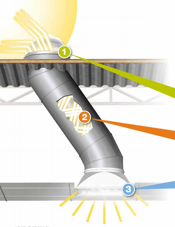 2、导光装置:独有的光线反射管道,使用了七彩无极限@导光管,这种由革命性的多层聚合材料所制的反射材料能反射更多的光线,是目前世界上最高效的反射材料。